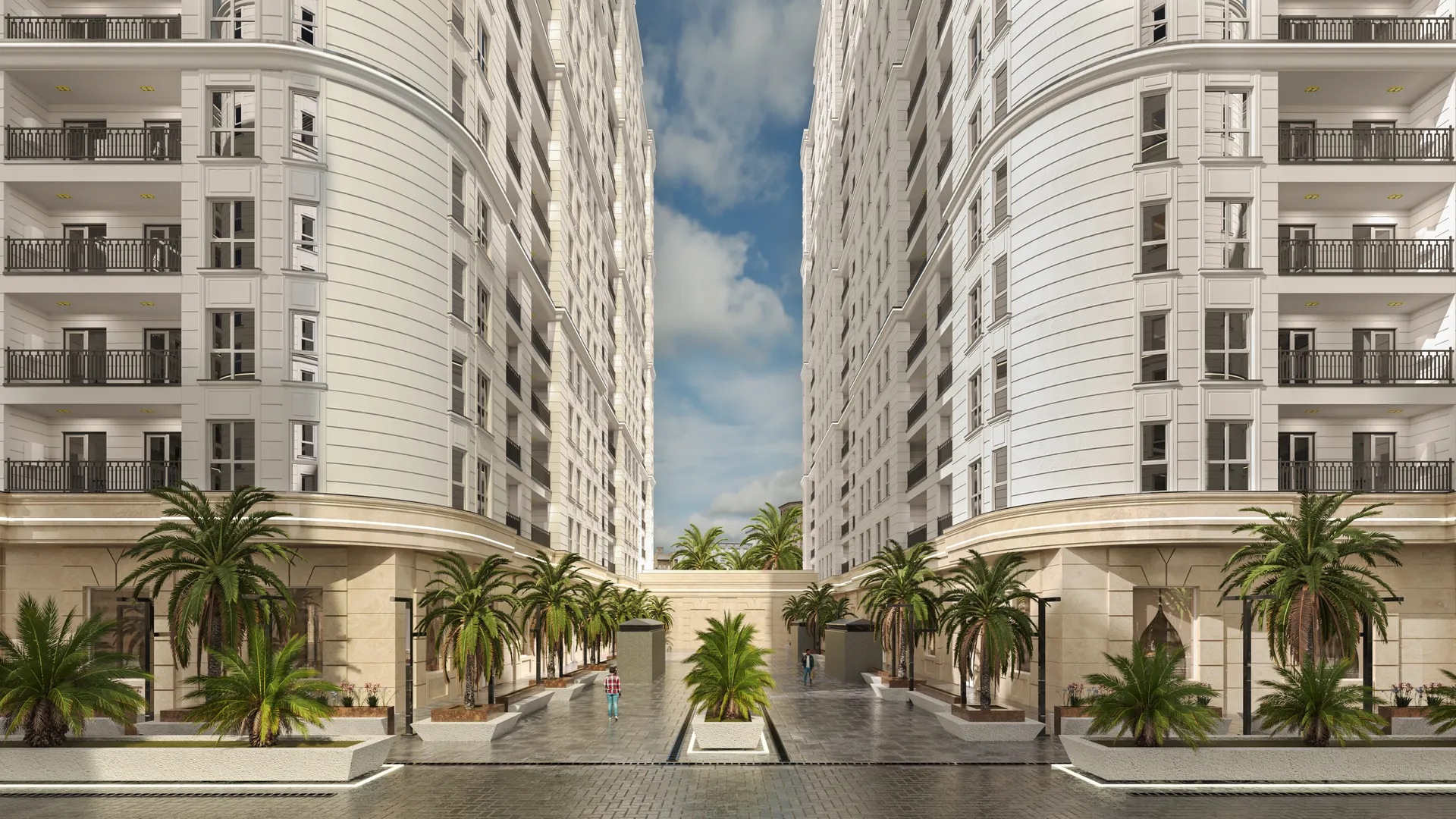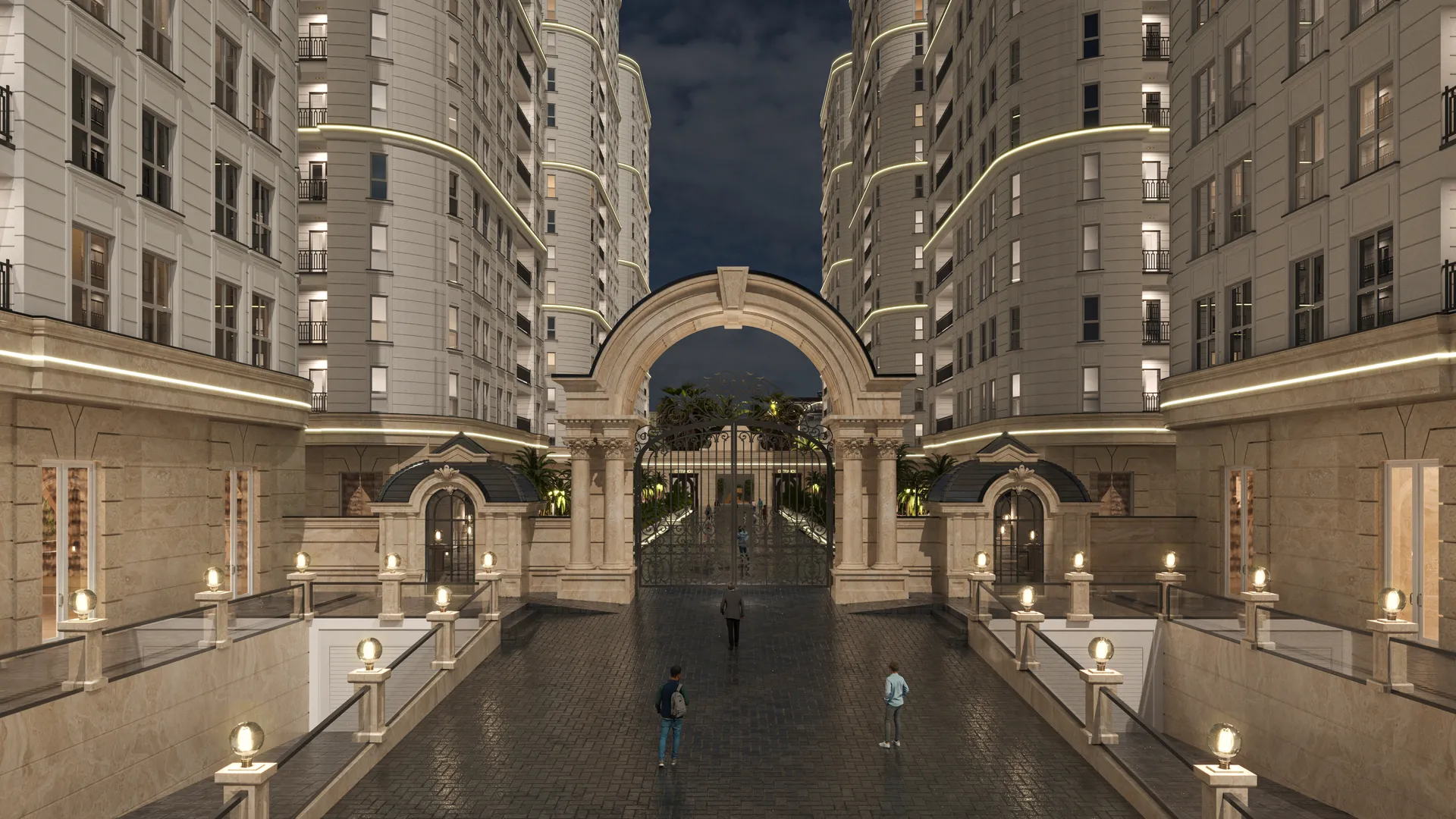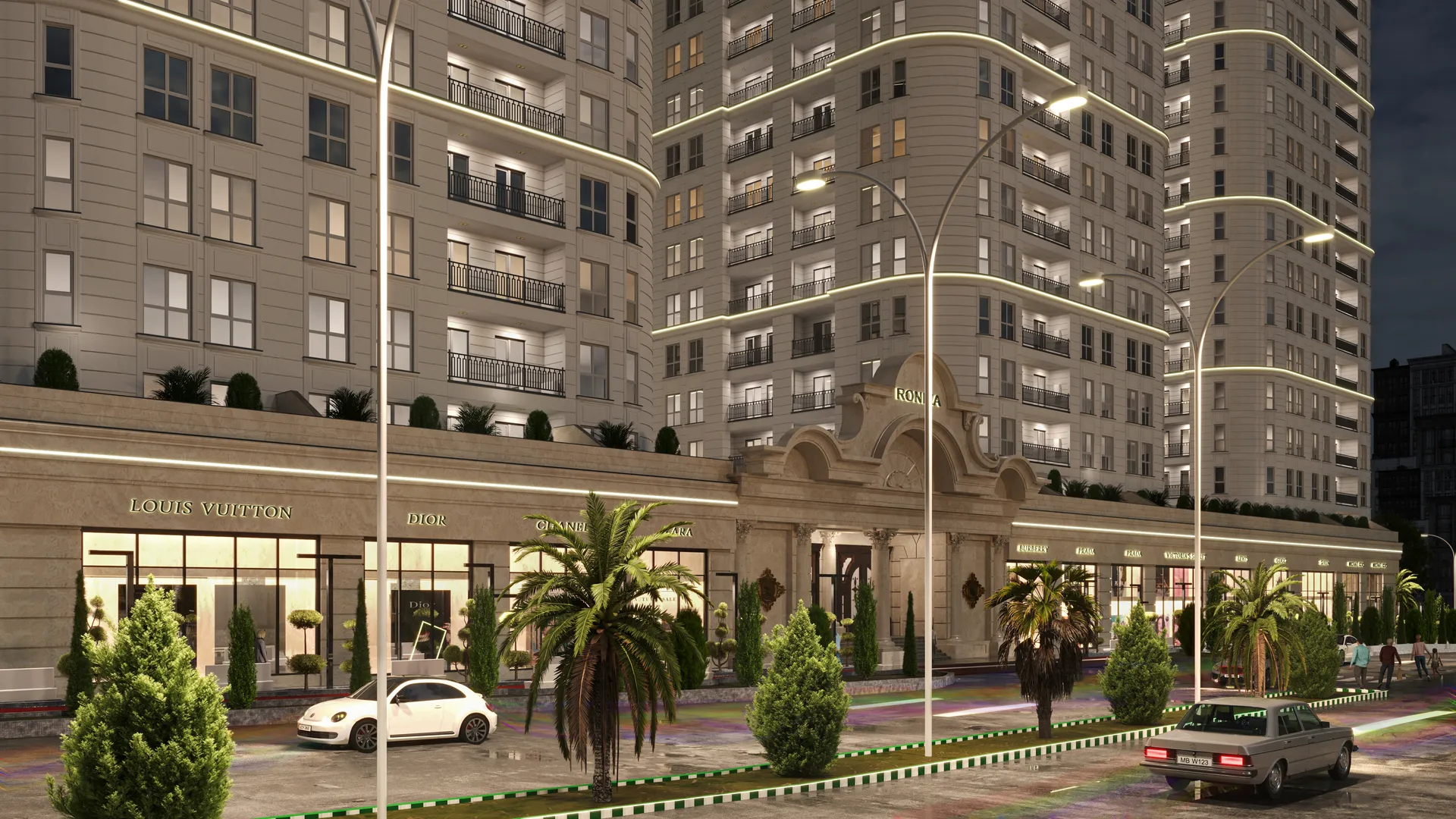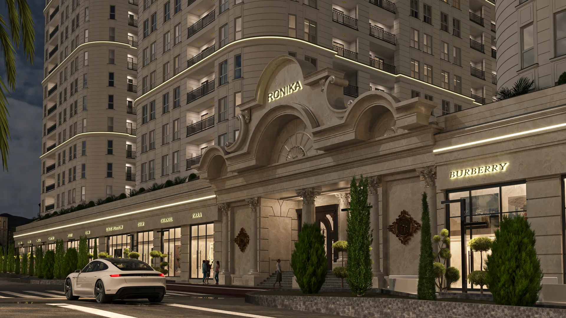- معماری کلاسیک و باوقار: طراحی نما و مشاعات با سنگکاریهای گسترده و جزئیات دقیق کلاسیک انجام شده که هویت بصری برند رونیکا پالاس را حفظ میکند.